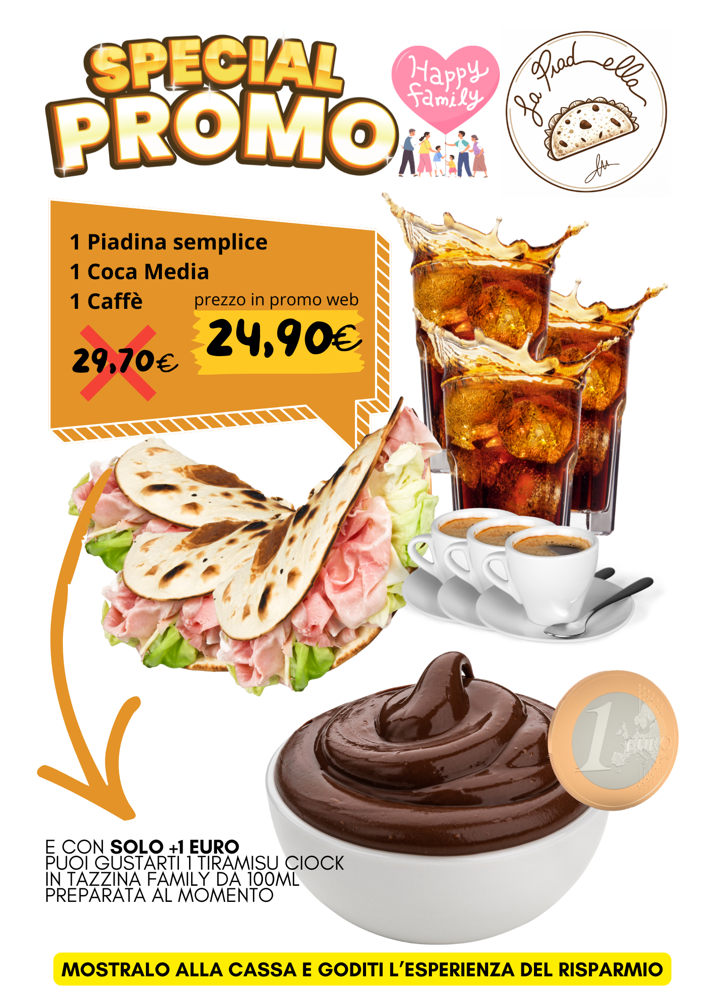 Ordina qualsiasi piadina artigianale con il menù formato famiglia e il dolce TIGELLA MAXI NUTELLA è tuo aggiungendo solo 1 euro.